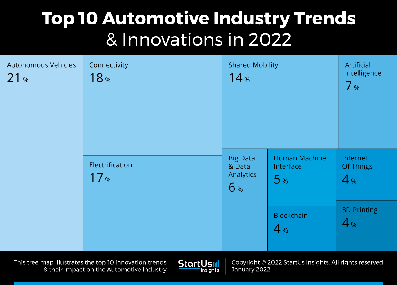 The Tree Map below illustrates the top 10 automotive industry trends that will impact companies in 2022. Emerging companies are working to build the first fully autonomous vehicle for city roads, which in turn accelerates the advancements in-vehicle connectivity and IoT. Further, as countries look to move away from fossil fuel use, a significant number of emerging electrification startups develop electric vehicles and the associated charging infrastructure. Another way to reduce the number of cars on the road involves promoting and creating shared mobility solutions that include first and last-mile connectivity along with urban mass transit.